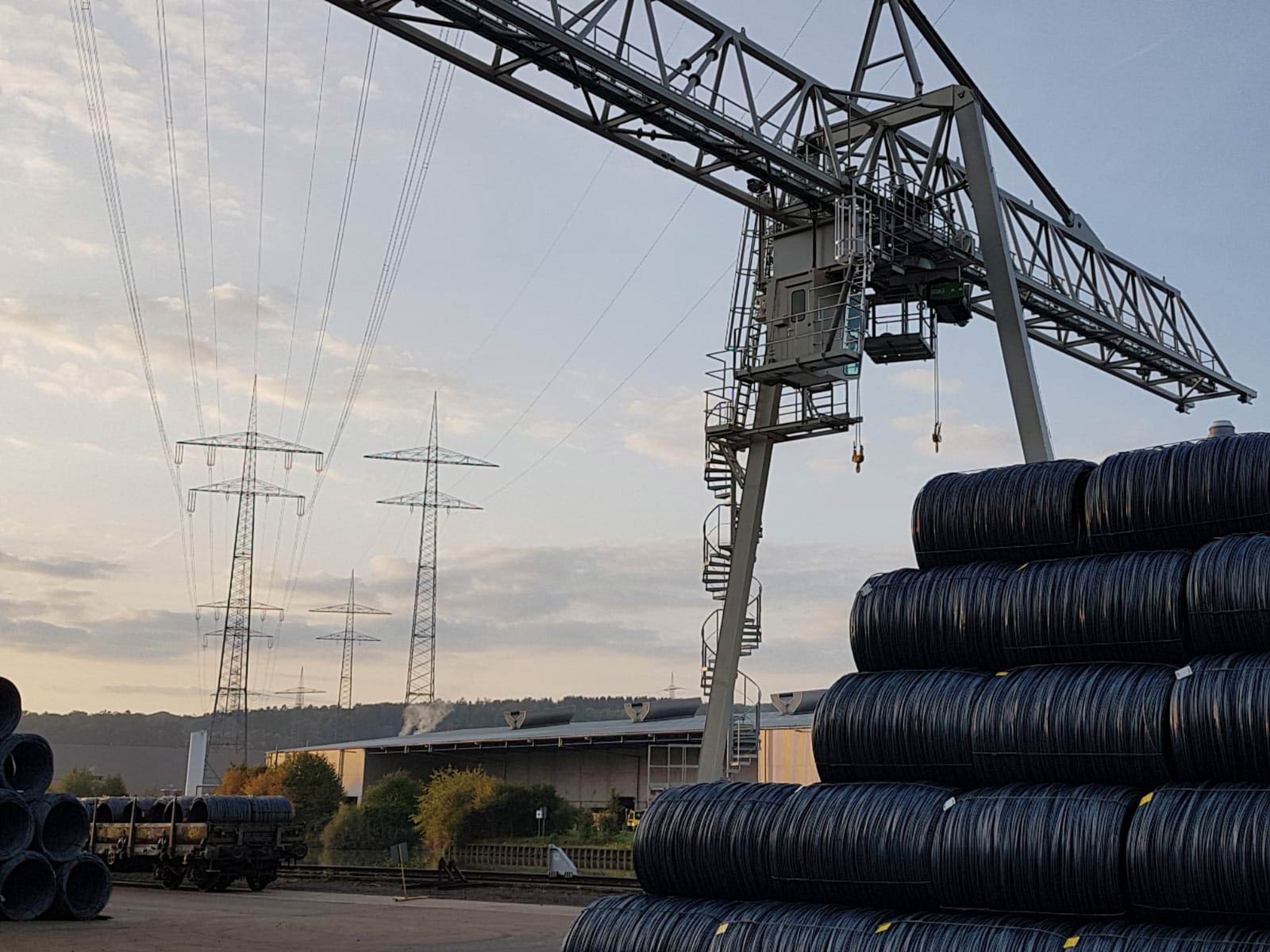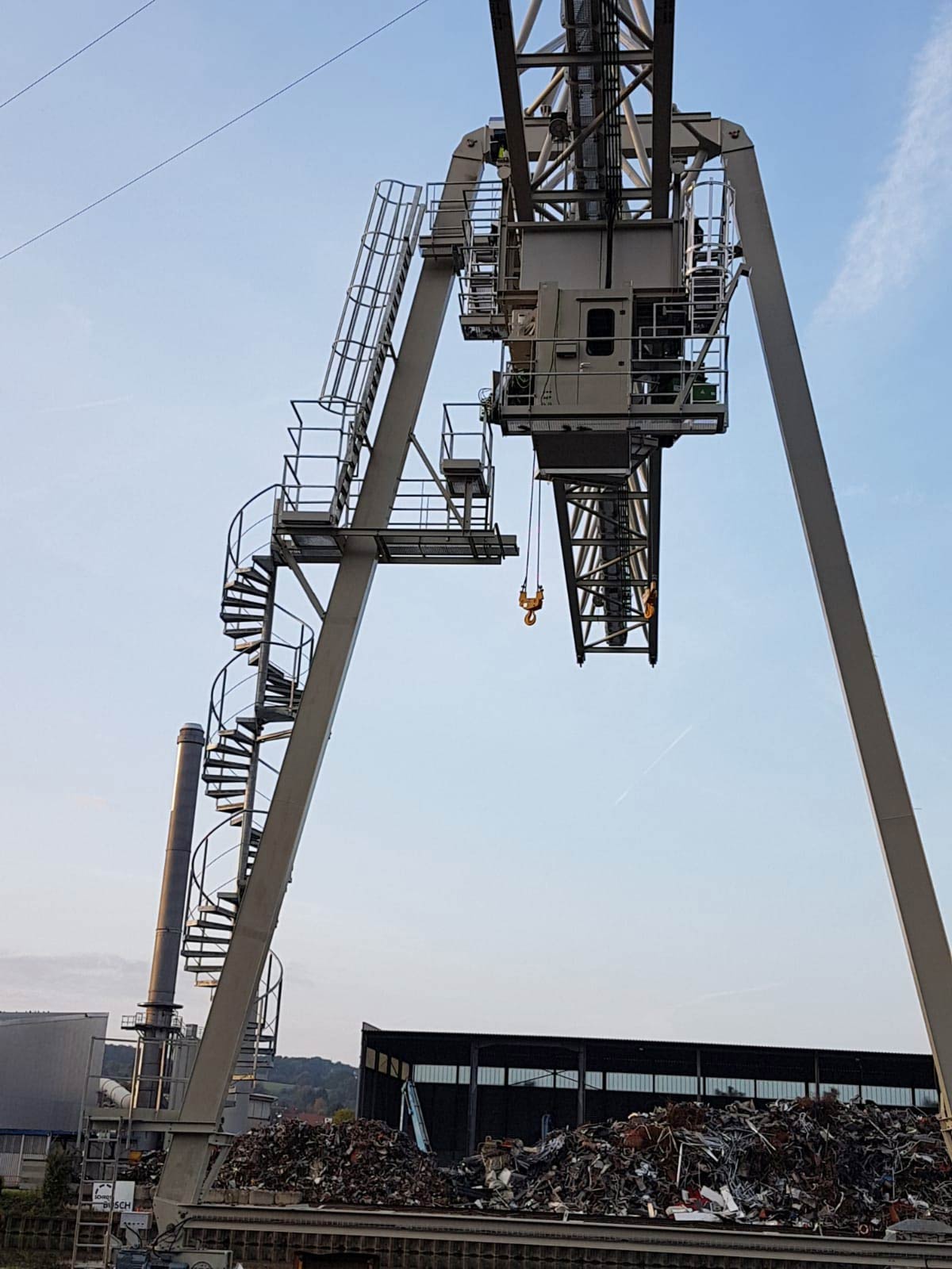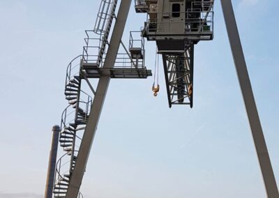 Für einen Portalkran konstruierten und fertigten wir eine 9 Meter hohe Spindeltreppe als sicheren Aufstieg.