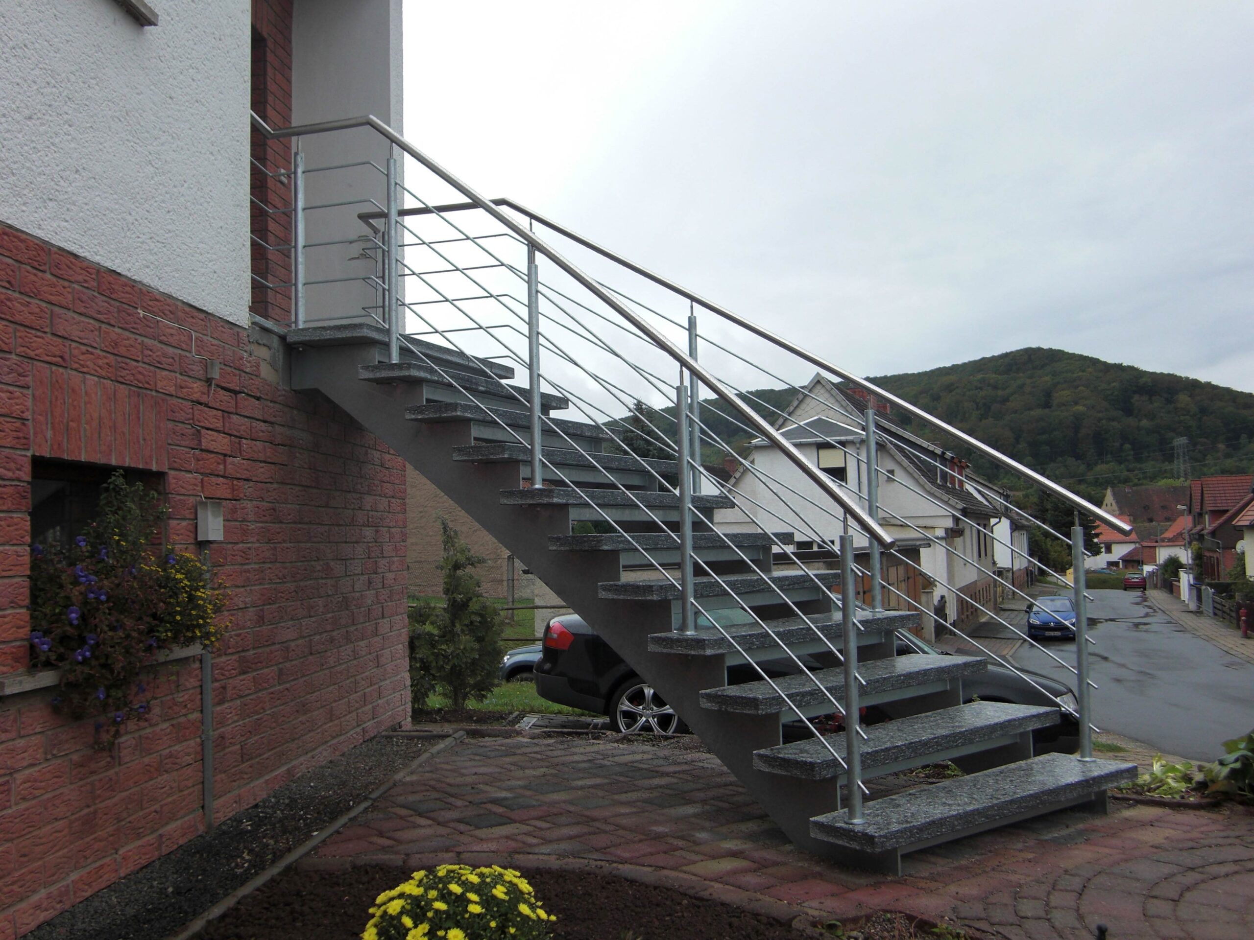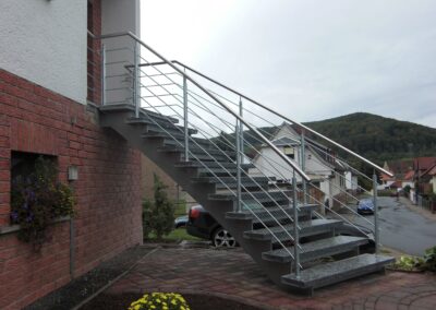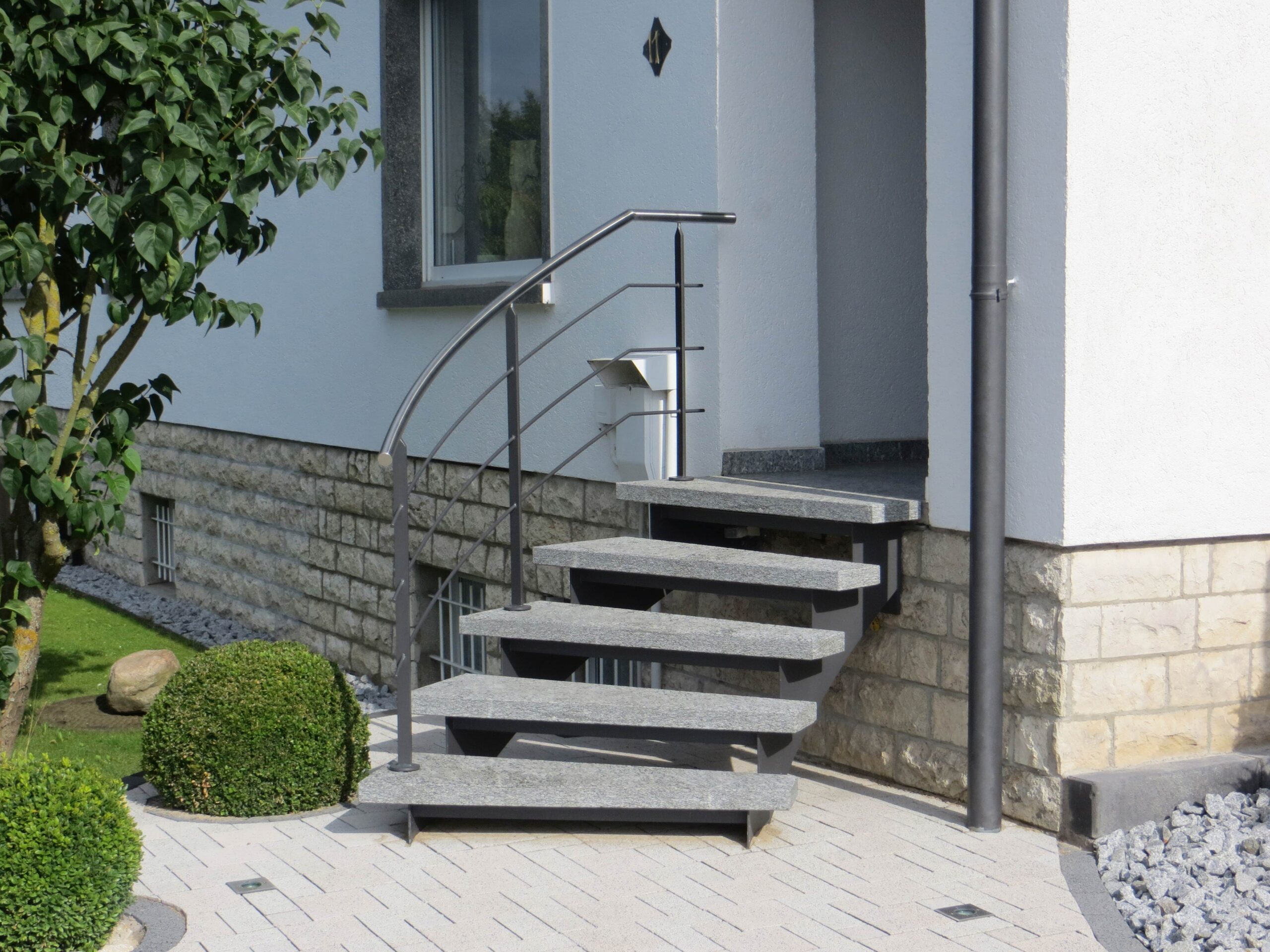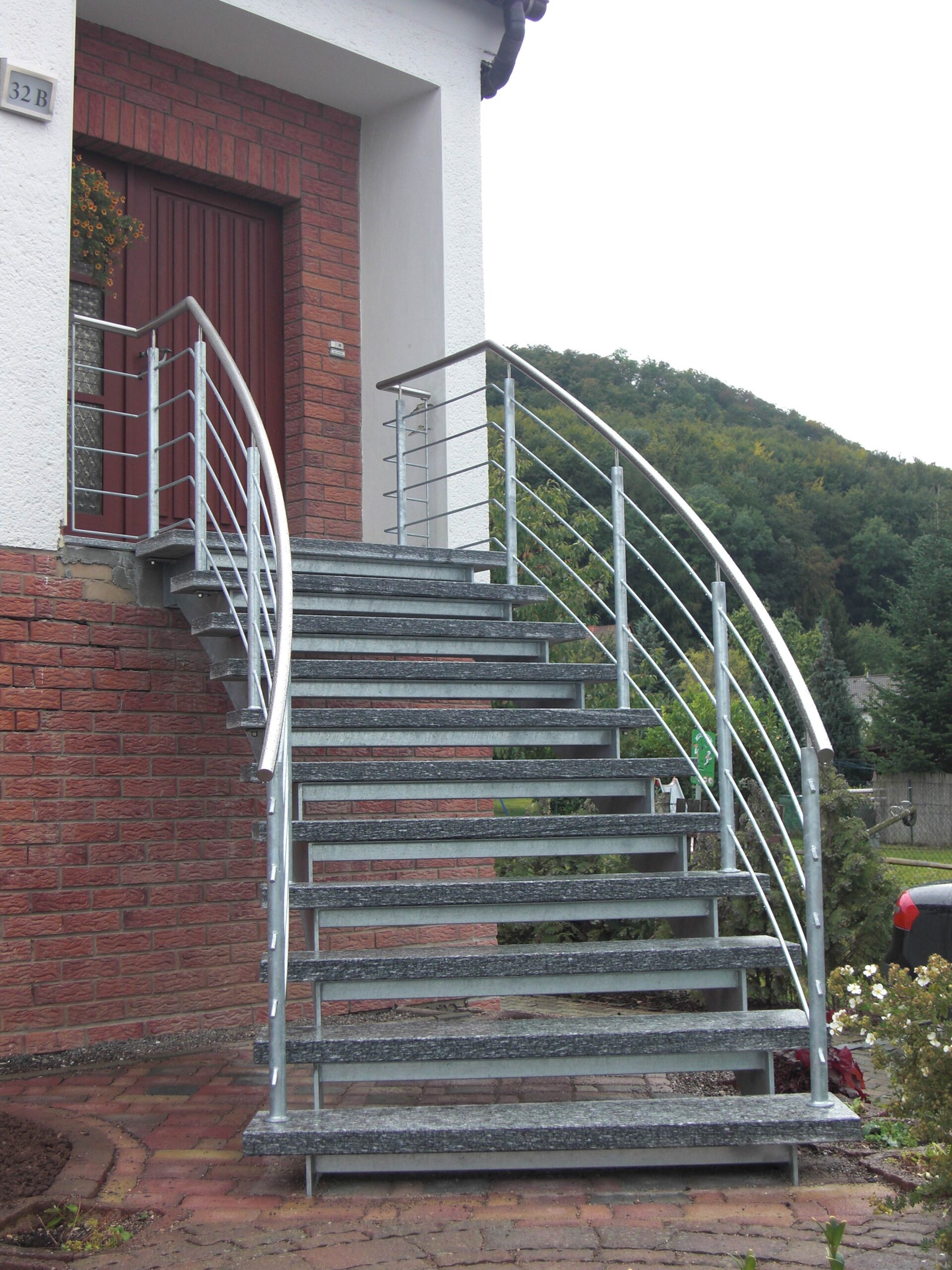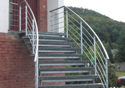 Die geschwungene Form verleiht Ihrer Fassade eine dynamische, architektonische Wirkung, die sowohl modern als auch zeitlos erscheint. Ob Wohnhaus, Gewerbebau oder öffentlicher Zugang – eine Bogentreppe setzt ein markantes Statement, ohne sich in den Vordergrund zu drängen.