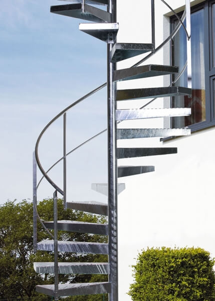 Die Außenspindeltreppen mit Blechstufen finden vorzugsweise Verwendung an öffentlich zugänglichen Wohngebäudefassaden oder wird an privaten Häusern als Gartentreppe montiert.