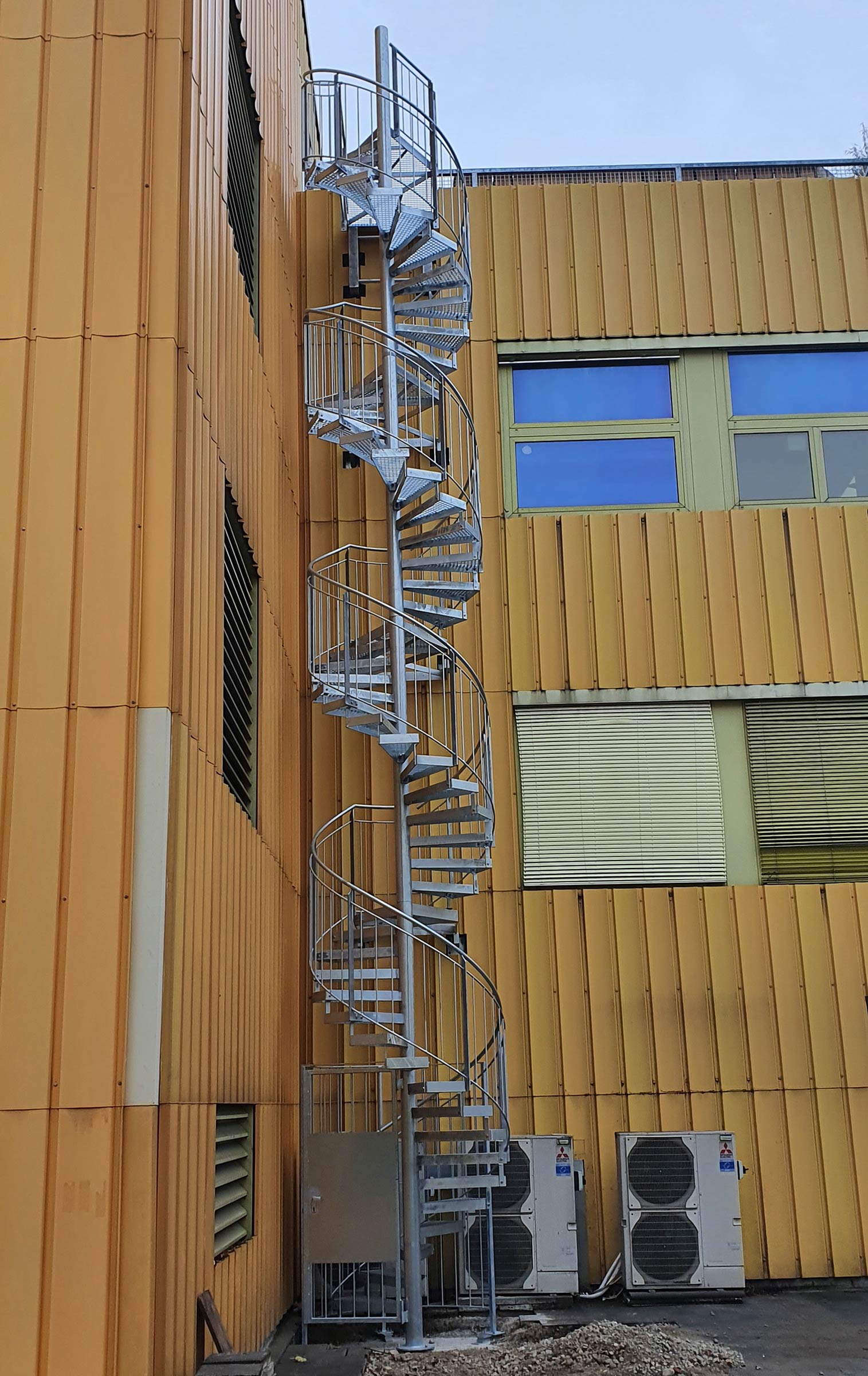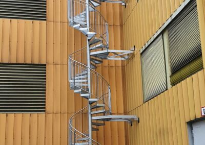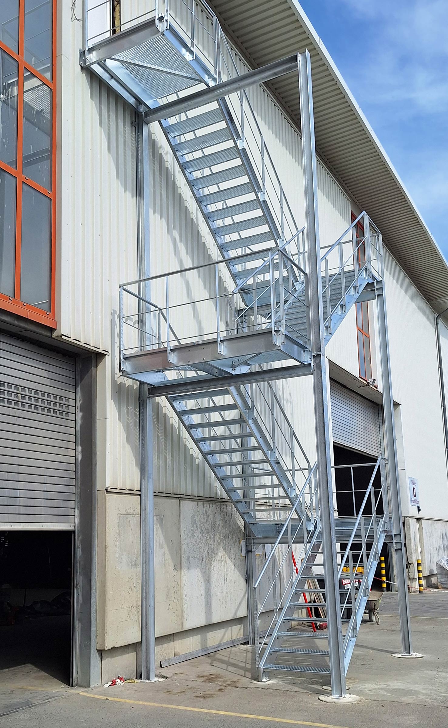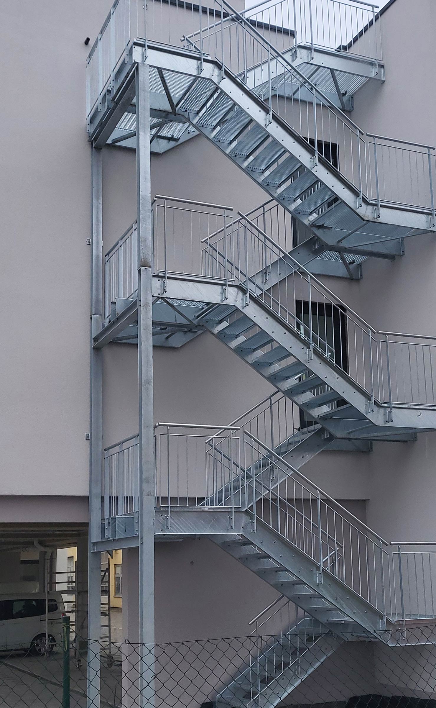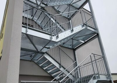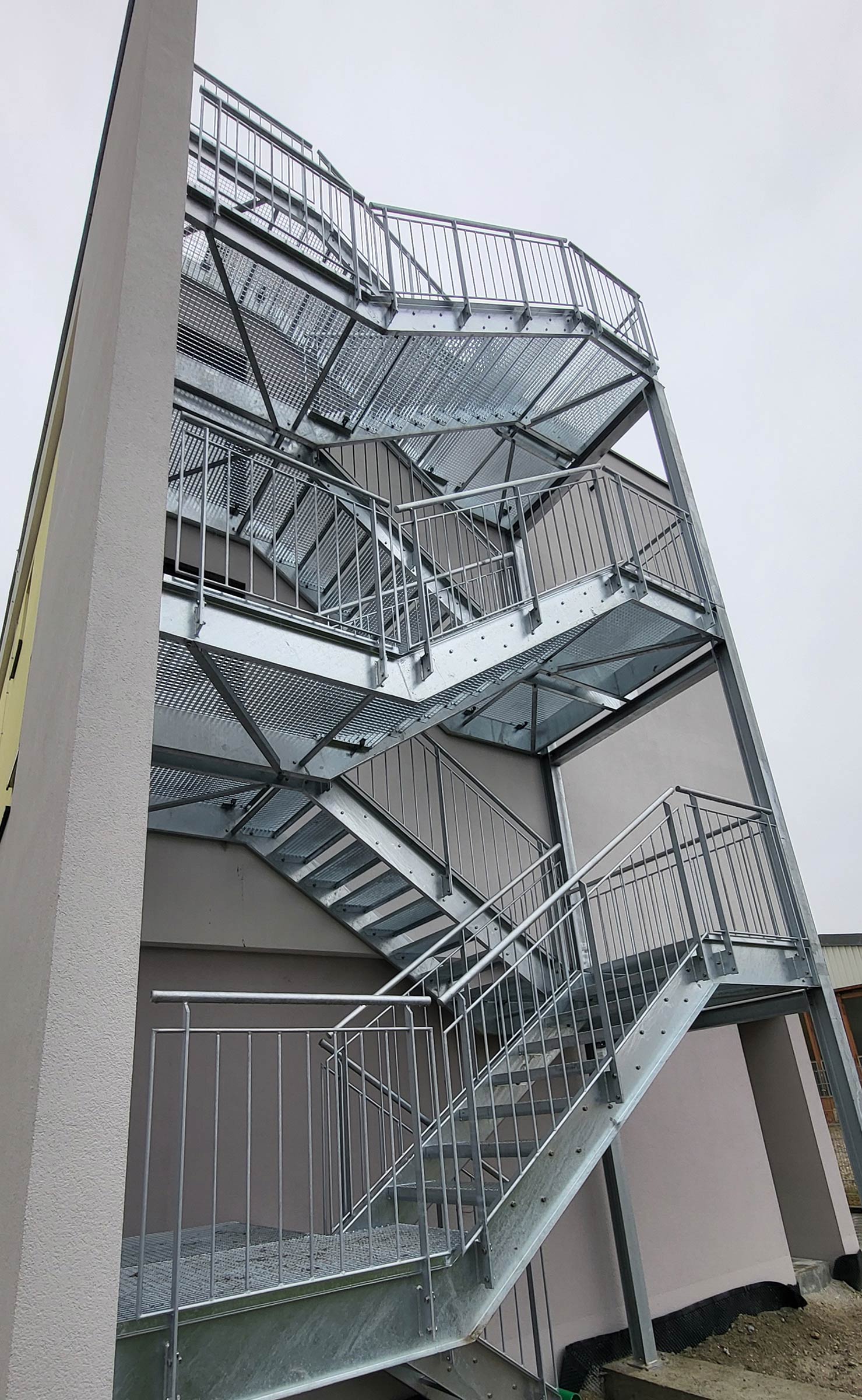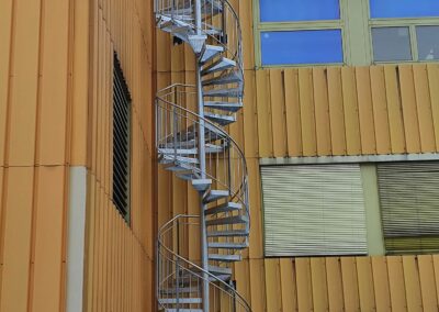 Treppentürme sind echte Arbeitstreppen – geschaffen für hohe Belastung und dauerhaften Einsatz. Besonders häufig kommen sie bei Schulen, öffentlichen Einrichtungen, Bürogebäuden oder Industriebauten zum Einsatz, wo ein zweiter Fluchtweg erforderlich ist.