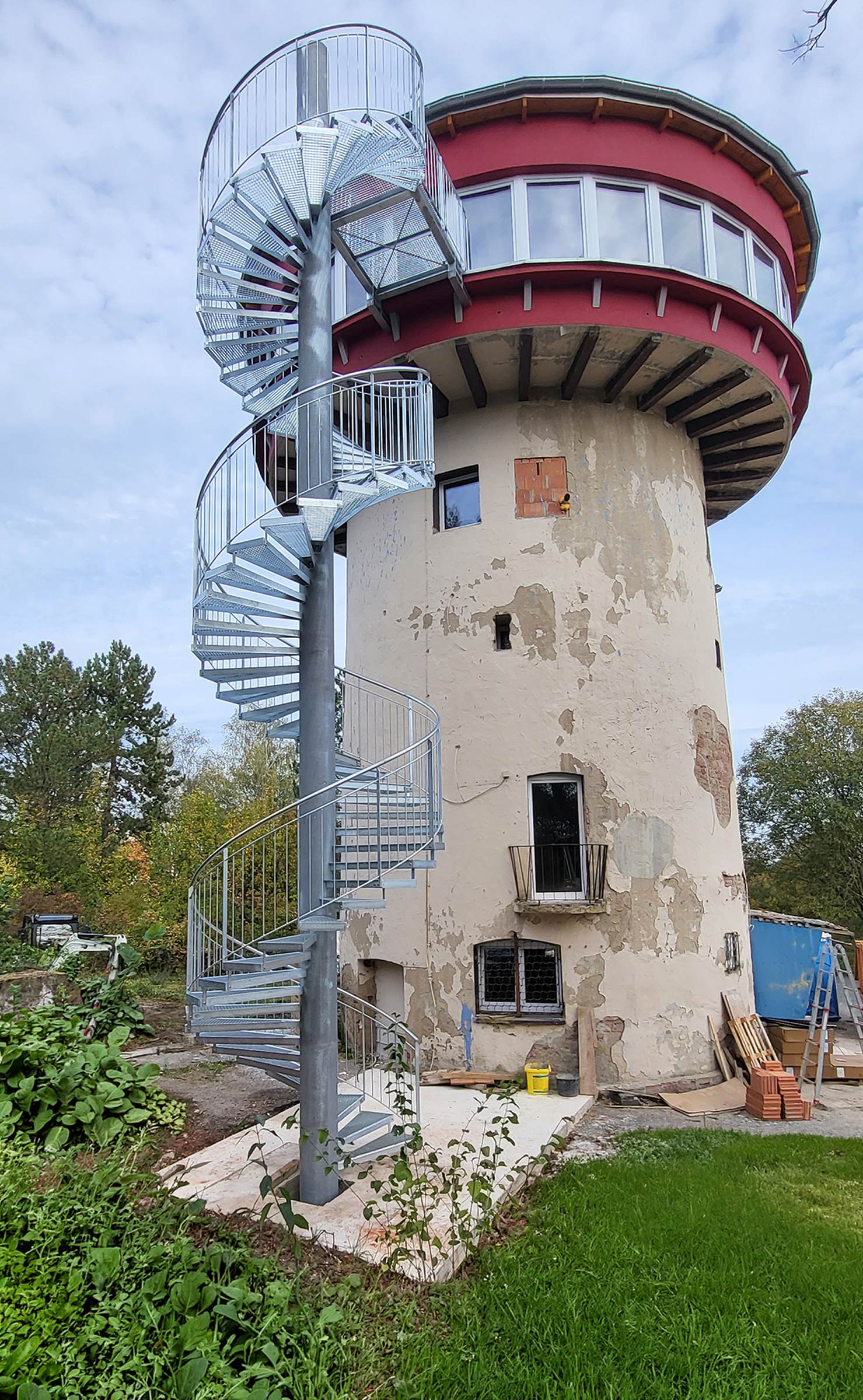 Wenn wenig Platz zur Verfügung steht oder eine besonders filigrane Treppenanlage gewünscht ist, bietet sich eine Spindeltreppe als Basis für den Treppenturm an – platzsparend, elegant und stabil zugleich.