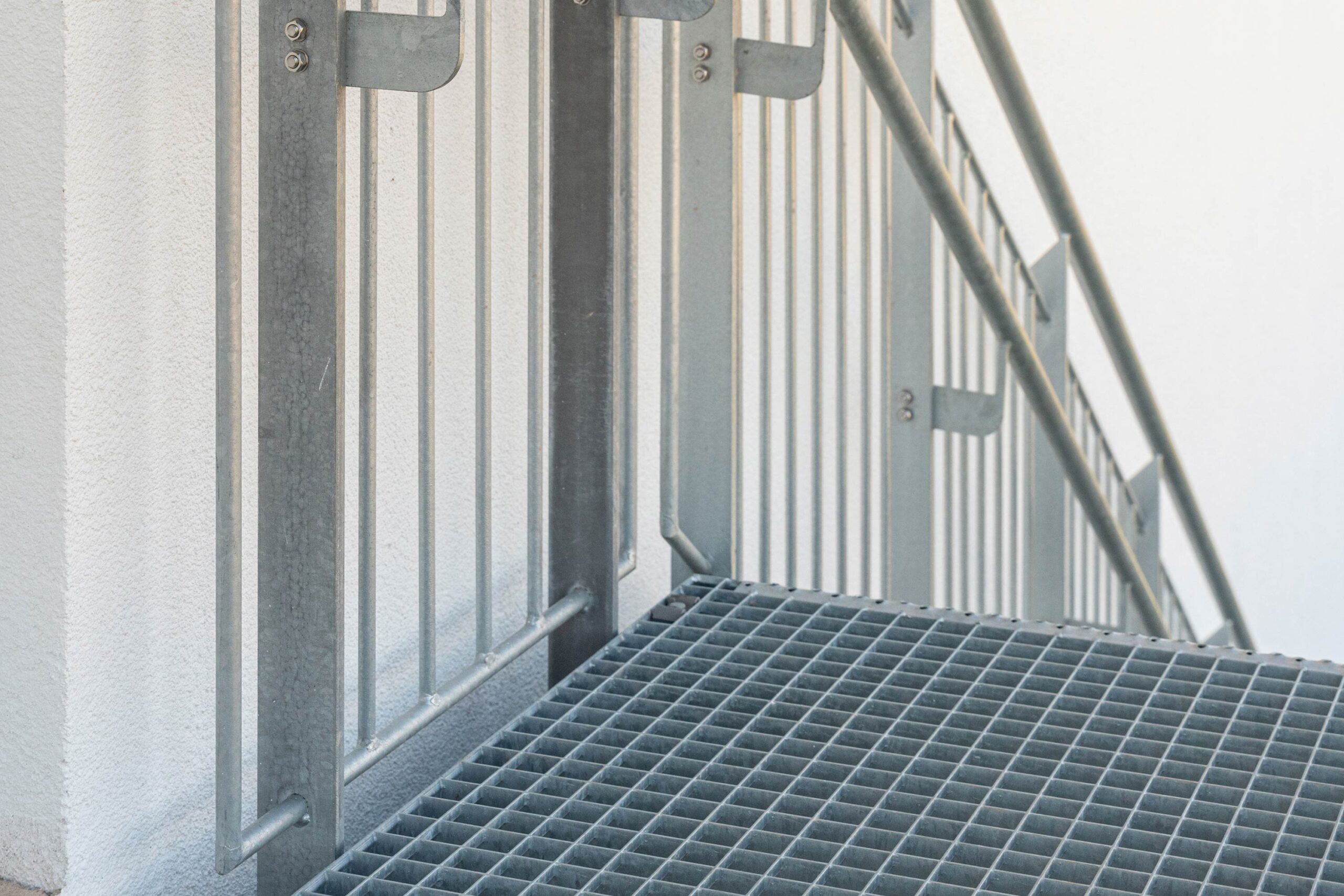 Ein besonders robustes Modell ist die Außenwangentreppe mit Gitterroststufen aus Flachstahl. Diese Variante überzeugt durch hohe Stabilität und Witterungsbeständigkeit. Sie haben die Wahl zwischen groben Maschen (30/30 mm) oder feinen Maschen (30/10 mm) sowie alternativen Belägen aus Riffelblech, Lochblech oder Holz. Die Unterkonstruktion kann gerade oder gewendelt ausgeführt werden – ideal für unterschiedlichste architektonische Anforderungen.