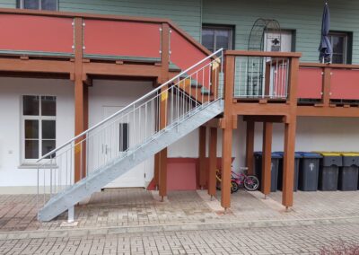 Die beiden tragenden Wangen geben der Treppe ihre charakteristische Form und Stabilität. Zwischen den Stufen bleibt Raum für Licht und Luft – das verleiht der Konstruktion Leichtigkeit und Transparenz. Offene Außenwangentreppen wirken modern und lassen sich flexibel in unterschiedliche Fassaden integrieren. Durch den Verzicht auf Setzstufen entsteht zudem eine klare, architektonische Optik, die das Gesamtbild des Gebäudes unterstreicht.