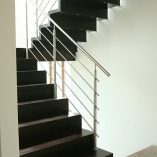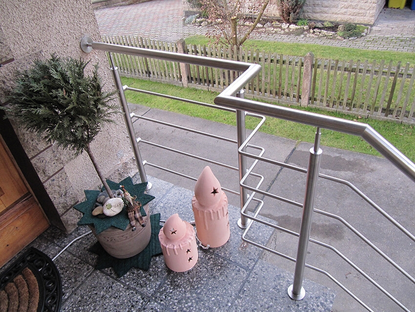 Treppengeländer werden die Pfosten und der Handlauf aus Rohr oder einem Flachstahl gefertigt und mit fünf steigenden, 12 mm starken Gurten kombiniert. Das Pfostengeländer ist grundiert, verzinkt oder in Edelstahl erhältlich. Von der Standardversion abweichend, kann der Handlauf aus Holz oder Edelstahl gefertigt werden. Darüber hinaus sind die fünf Gurte ein Vorschlag unsererseits; ohne Weiteres kann ihre Anzahl erhöht oder reduziert werden.