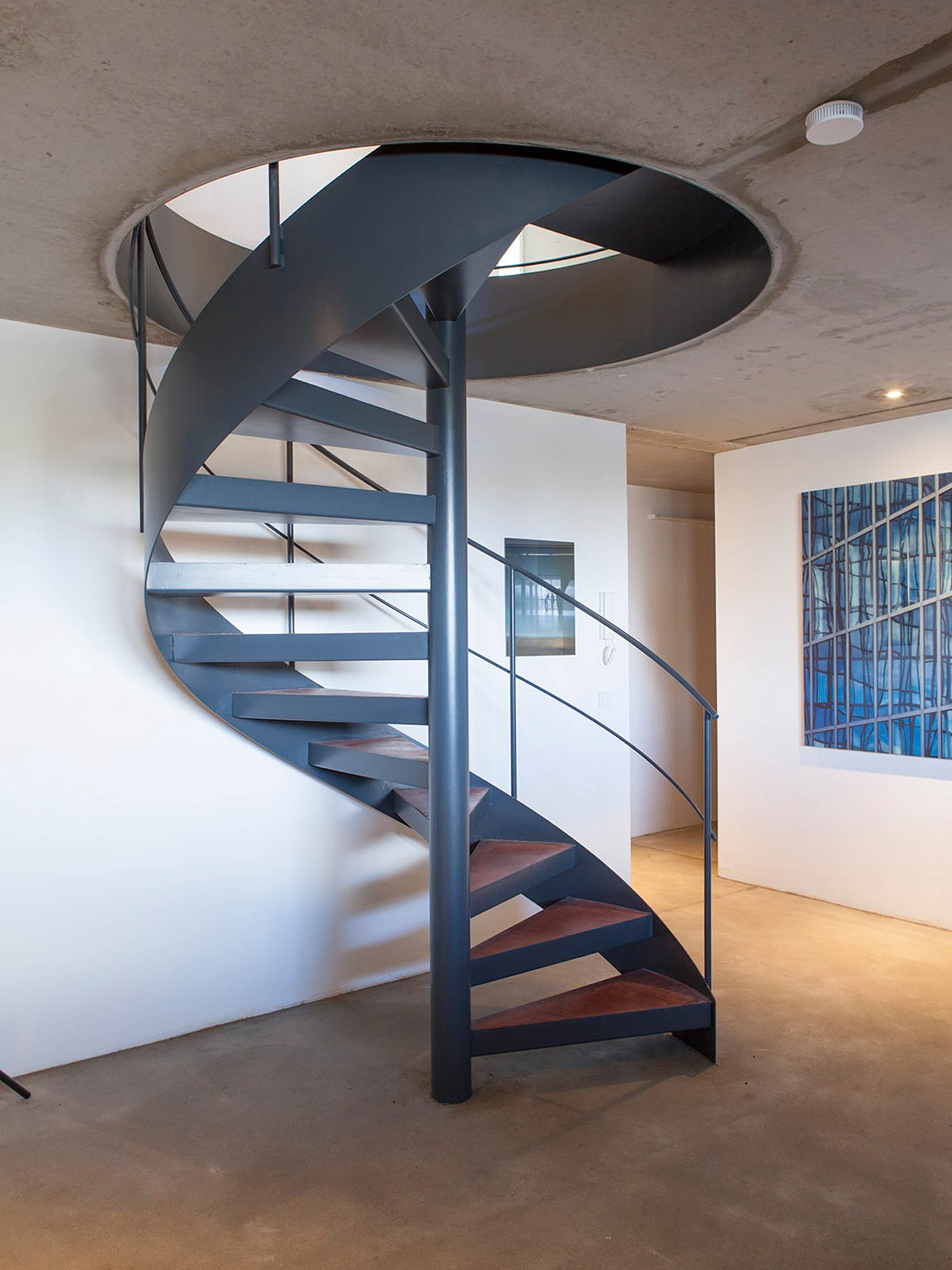 Im Innenbereich sorgt die Spindeltreppe für einen einladenden Auftritt: Sie schafft Bewegung, Struktur und Offenheit im Raum. Außen überzeugt sie durch Stabilität, Witterungsbeständigkeit und eine klare, architektonische Formensprache.