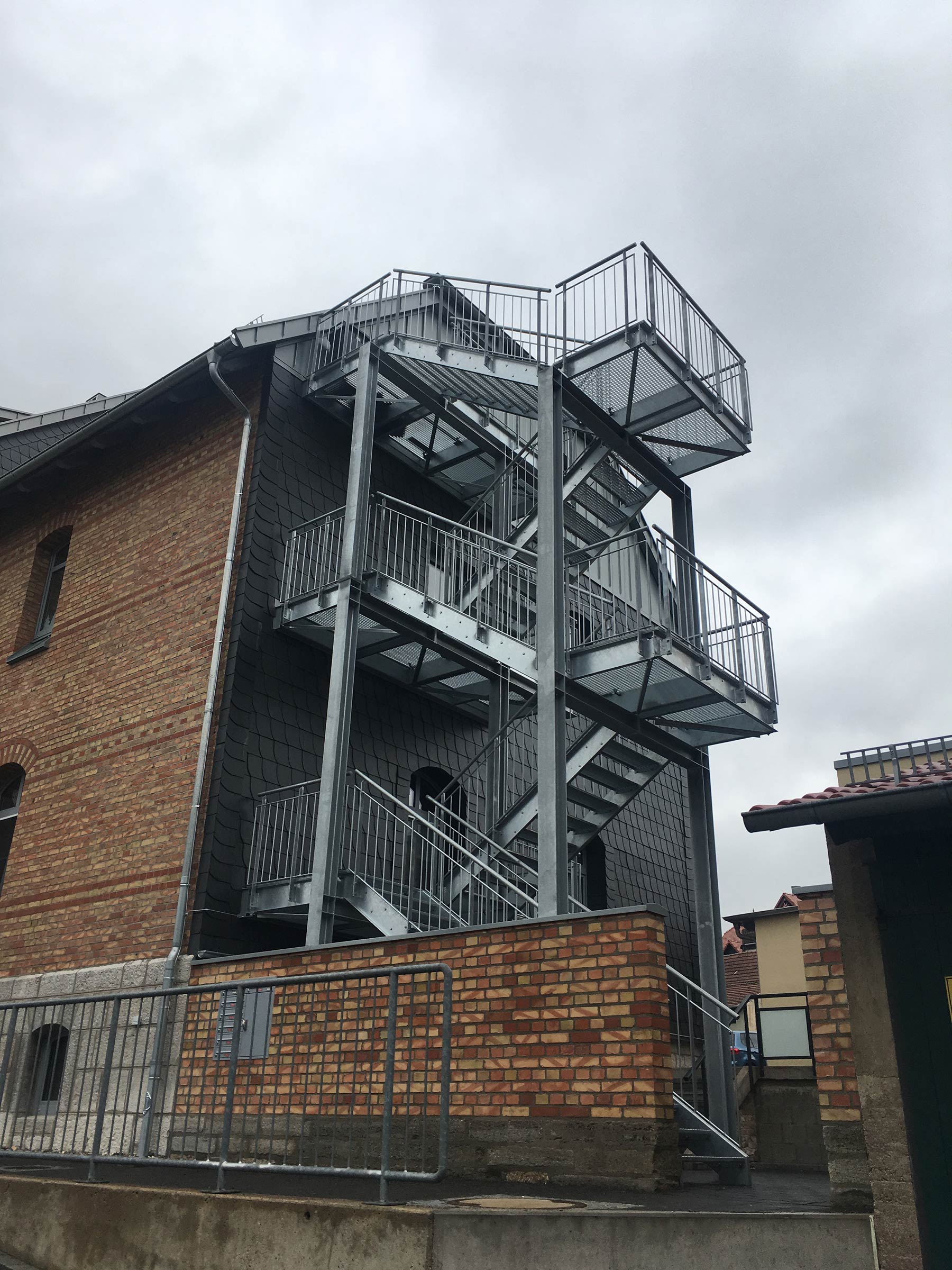Für das historische Schulgebäude in Bickenriede, das in ein modernes Mehrfamilienhaus umgebaut wurde, haben wir eine maßgeschneiderte Fluchttreppe gefertigt.
